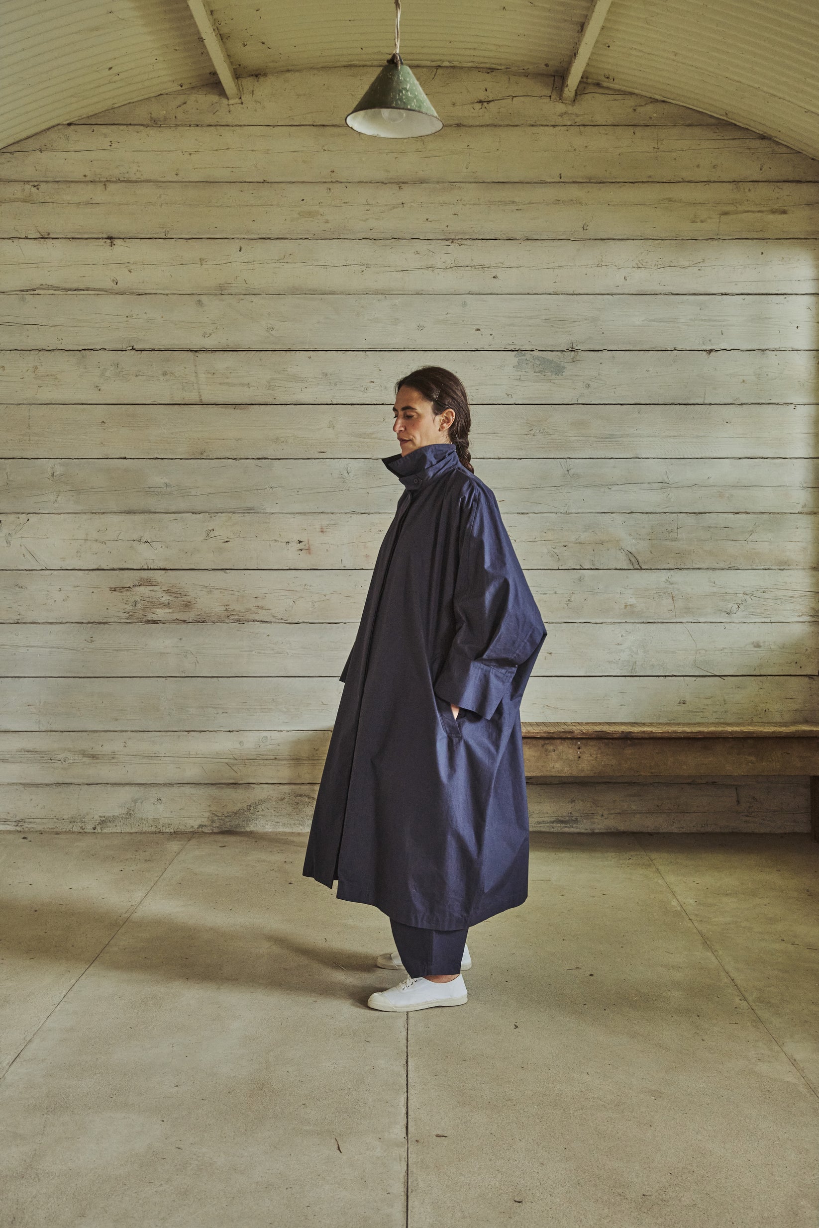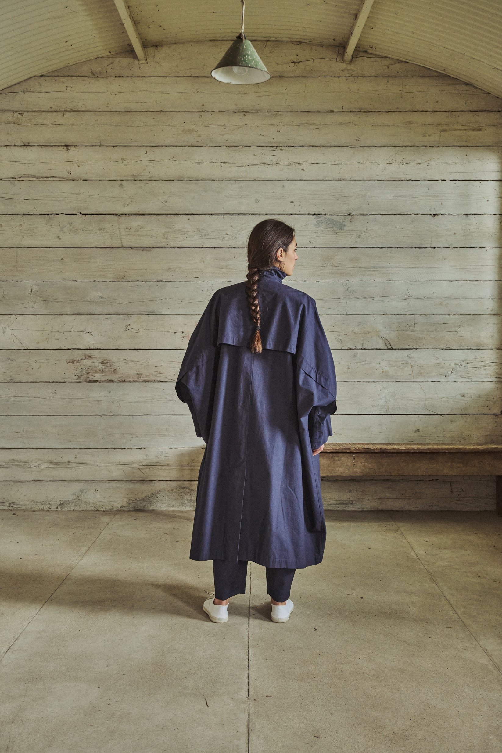 large square-cut coat, horizontal back vent, slant pockets with flaps