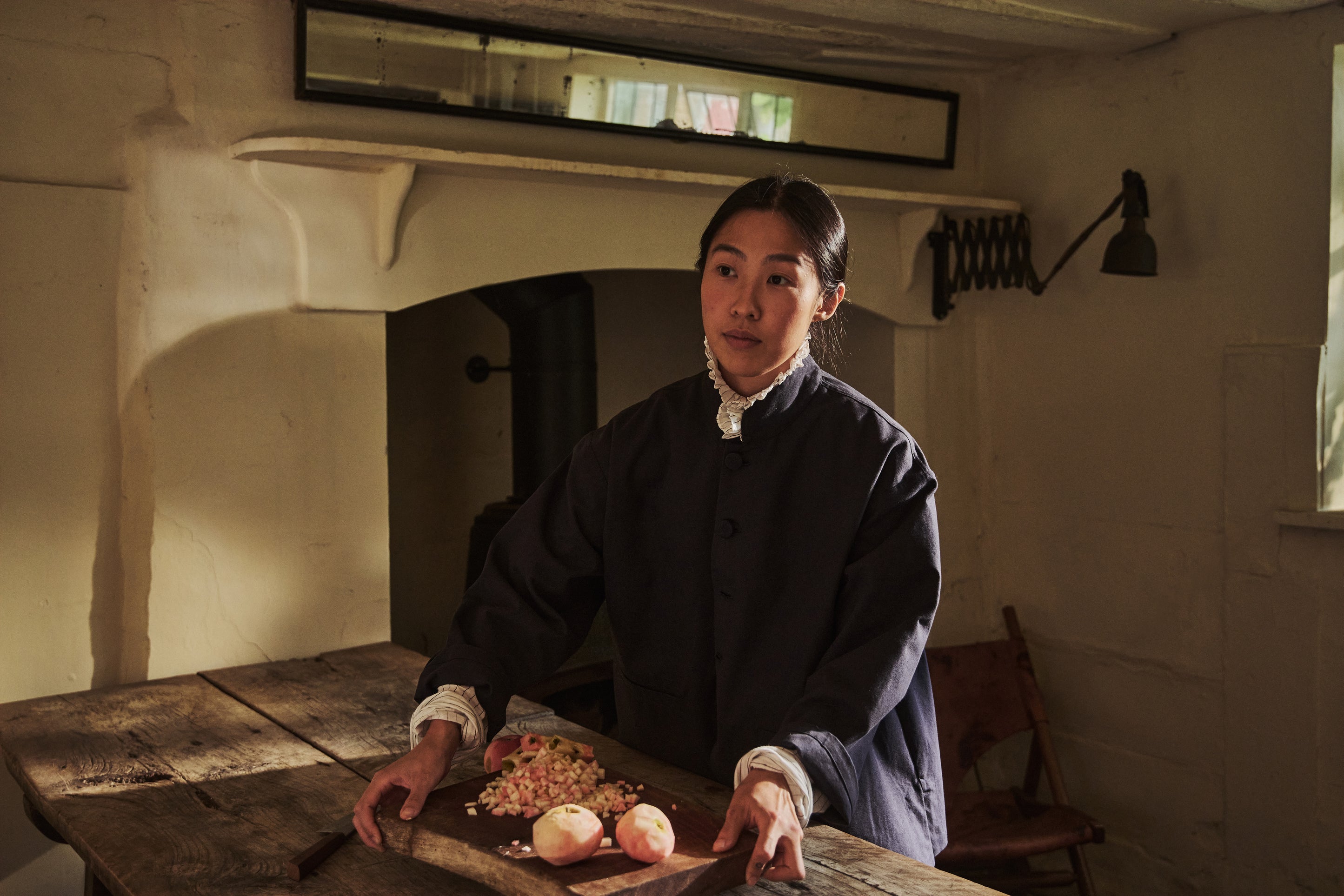 basic a-line jacket, high collar, welted pockets, covered buttons
