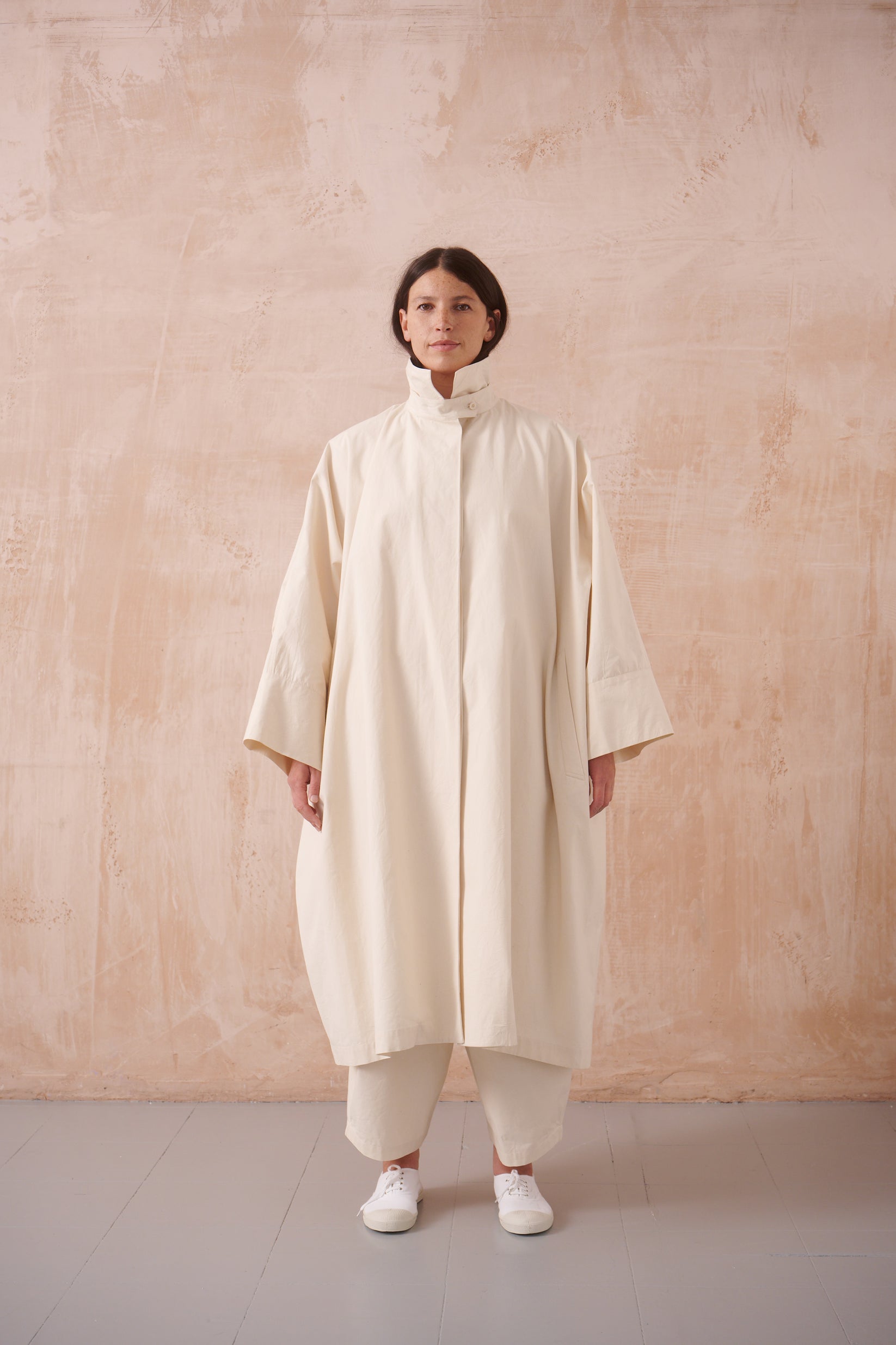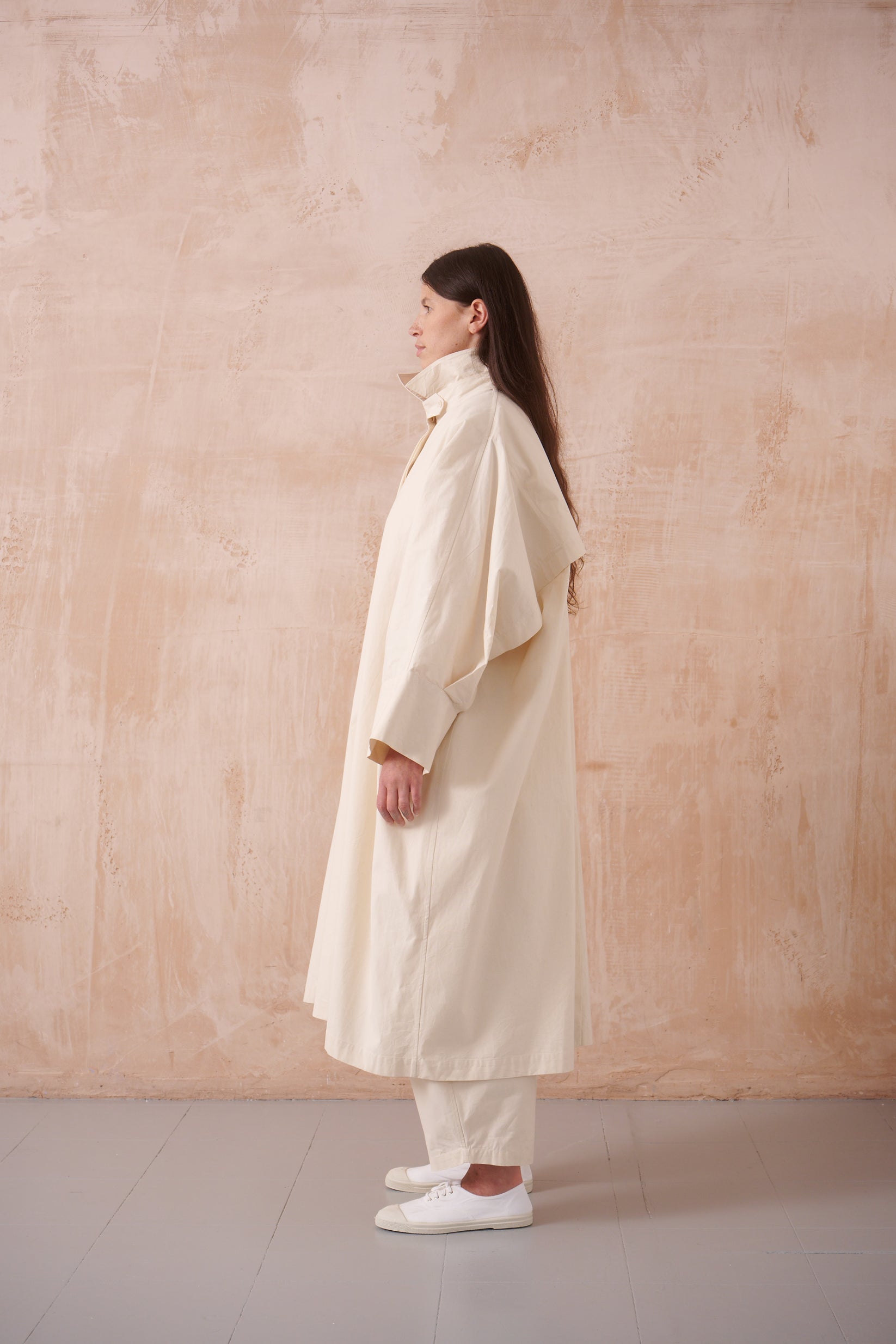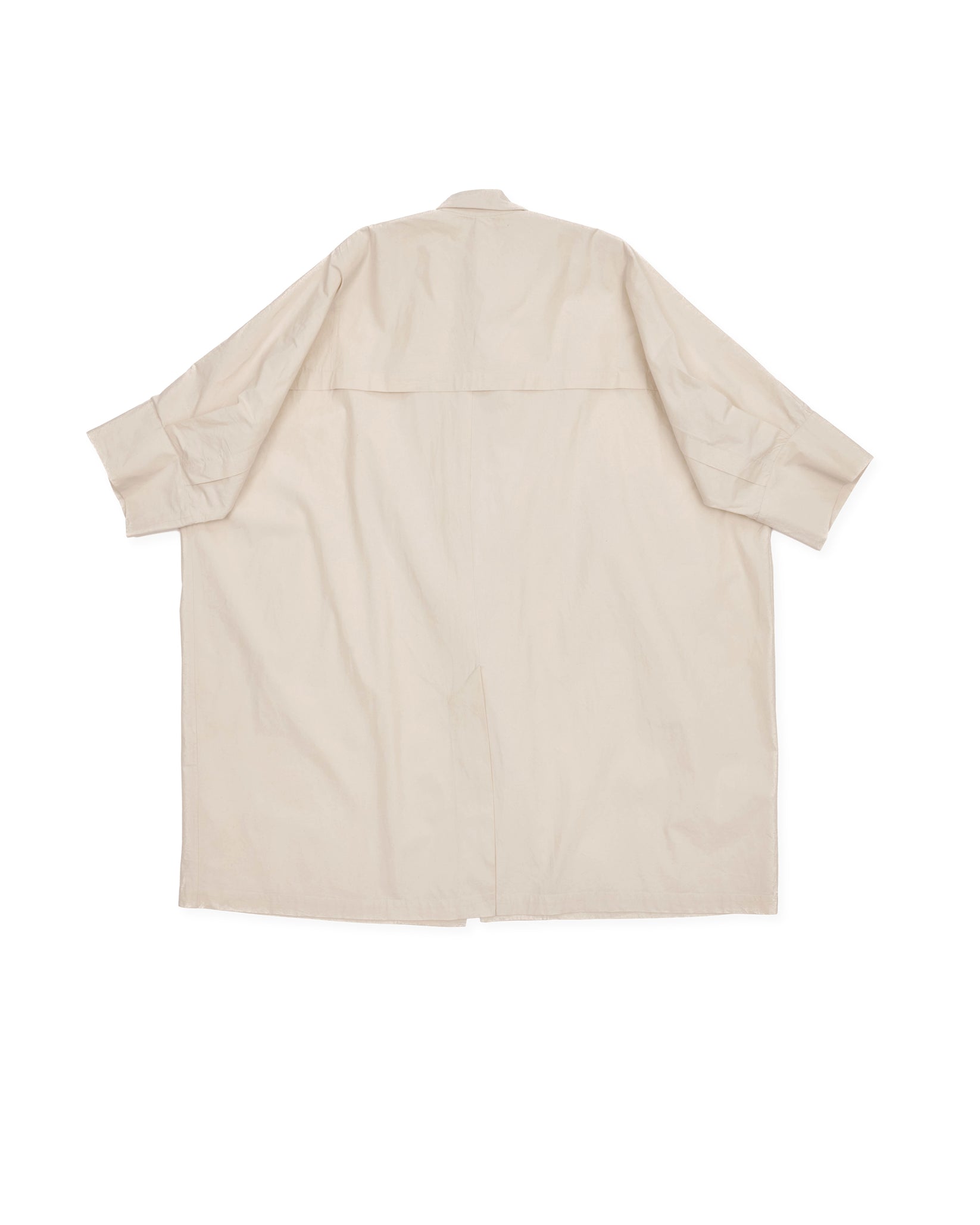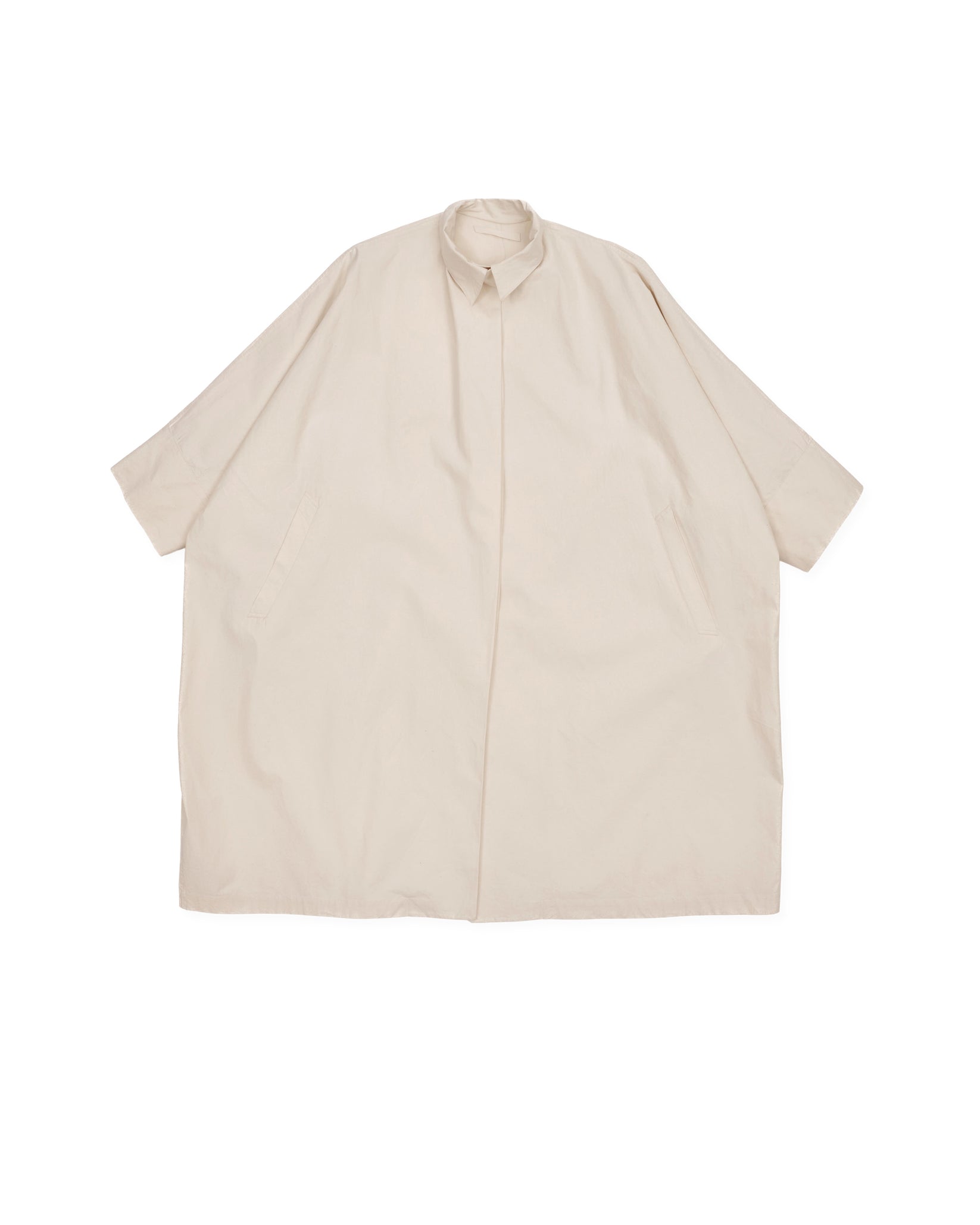 large square-cut coat, horizontal back vent, slant pockets with flaps