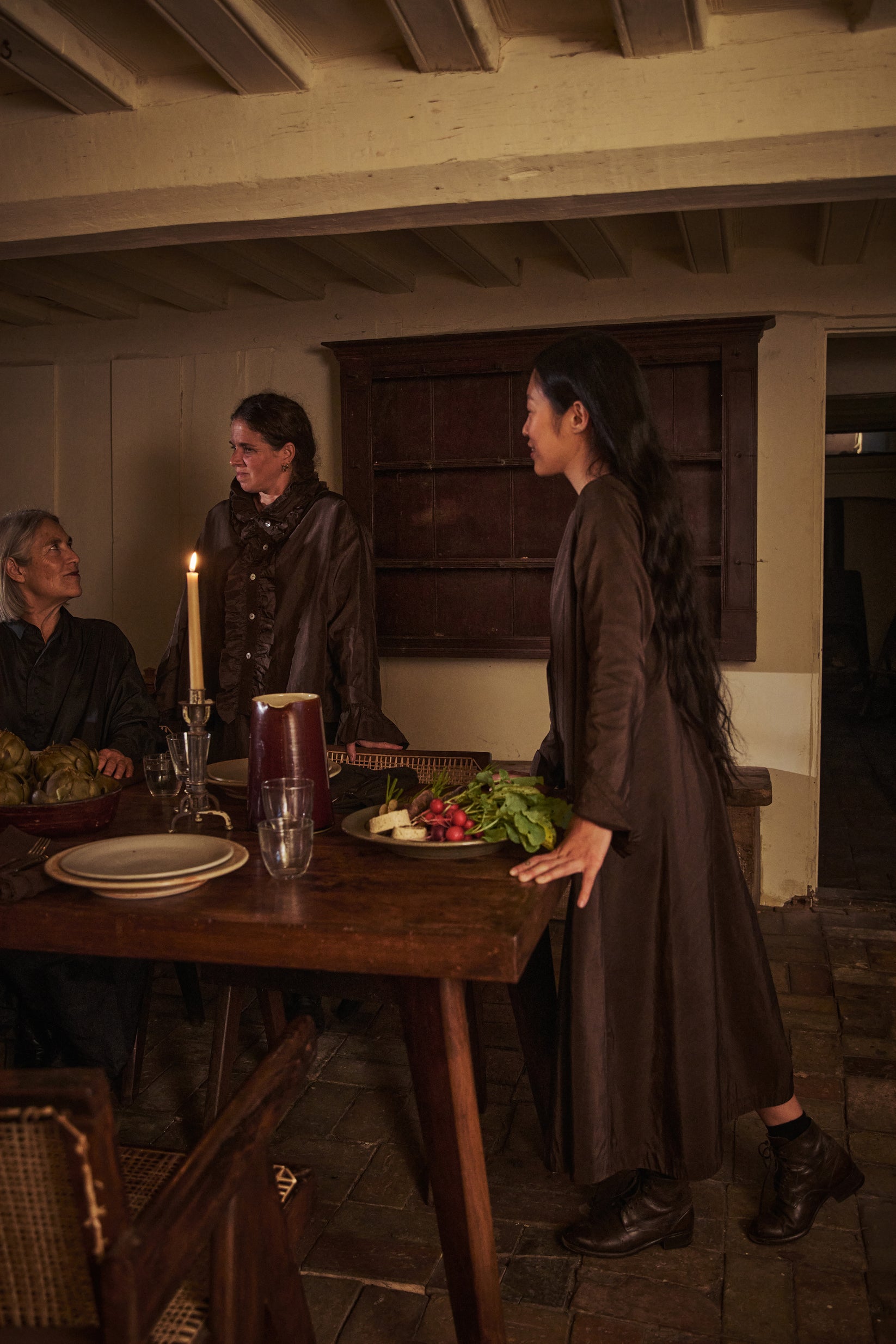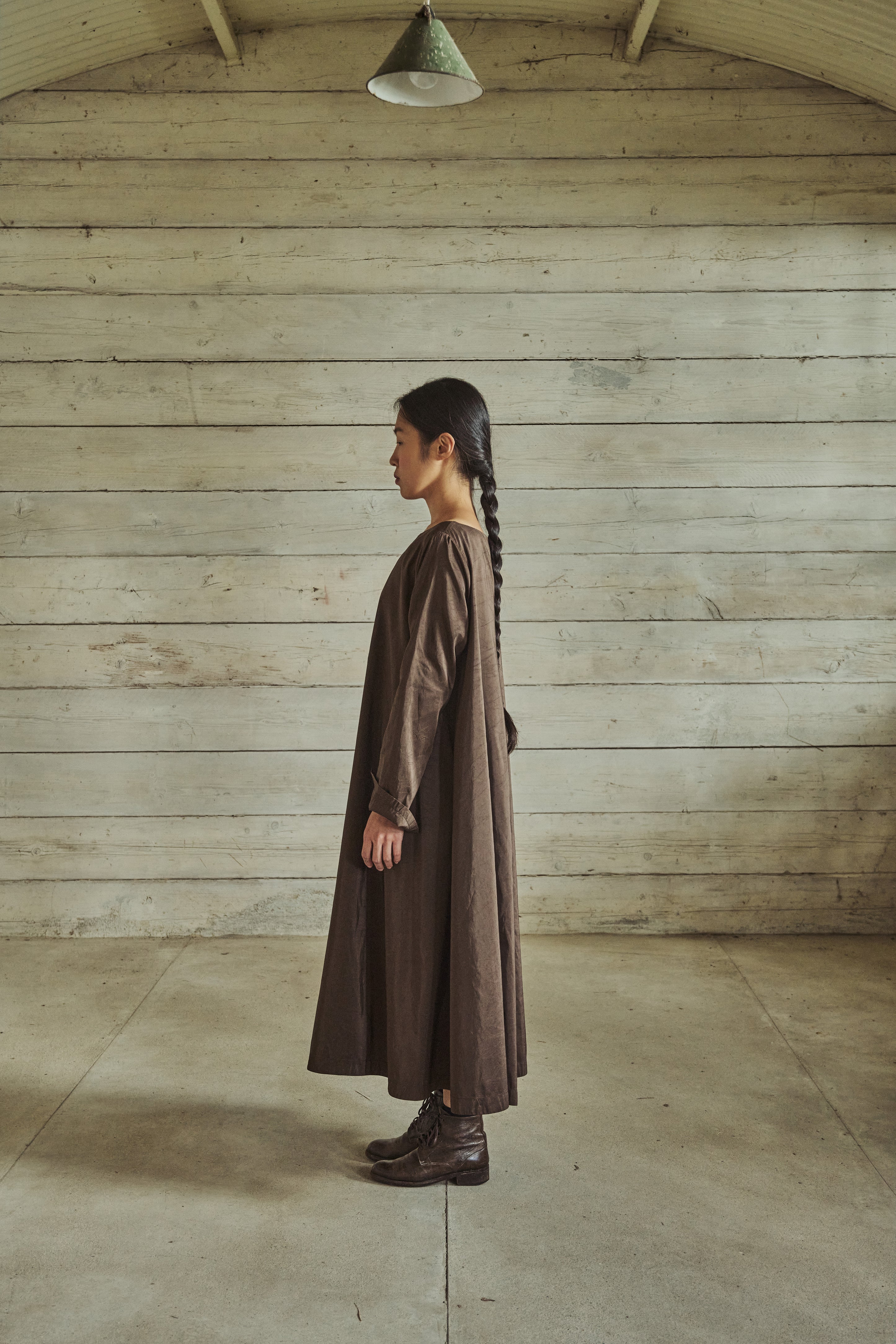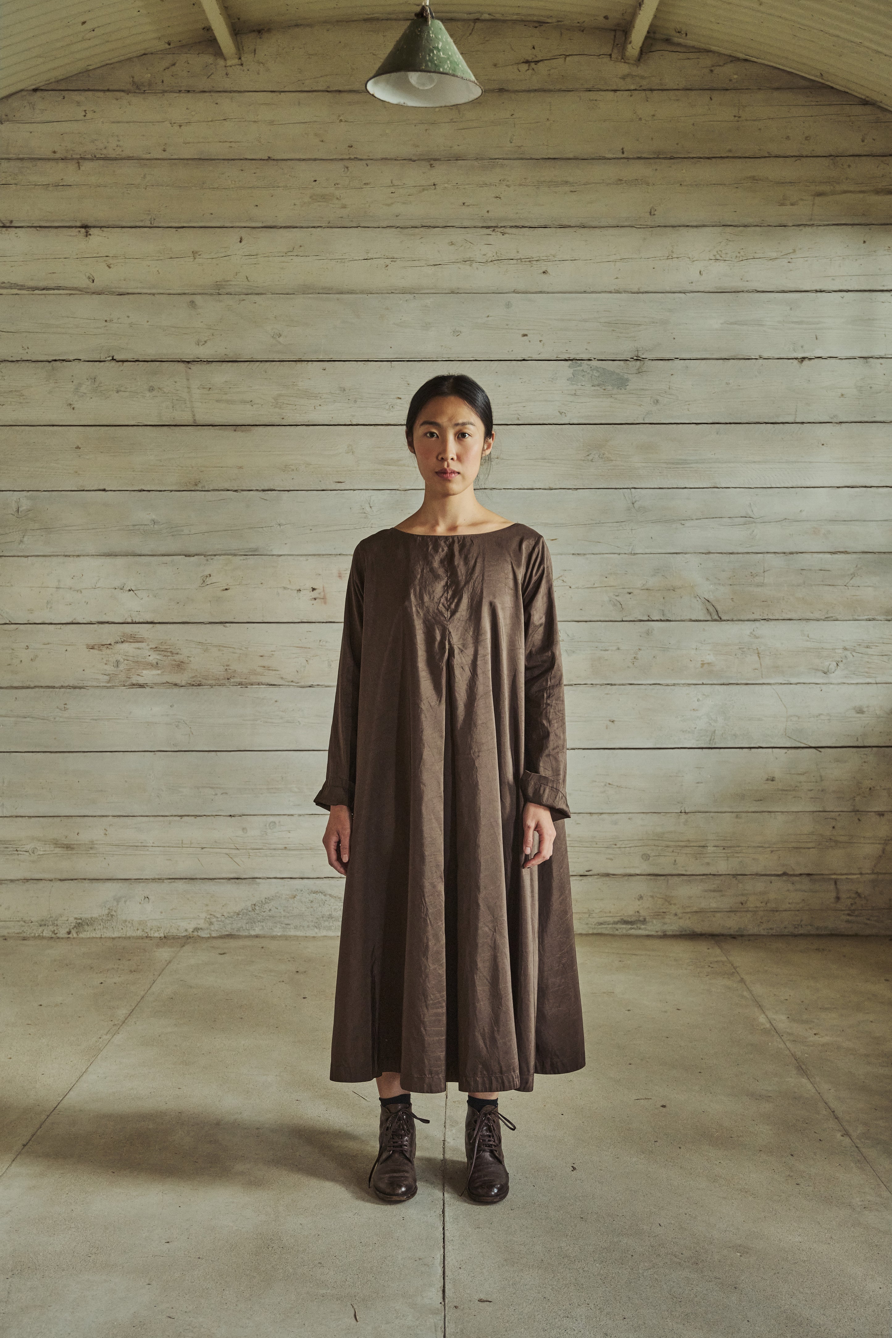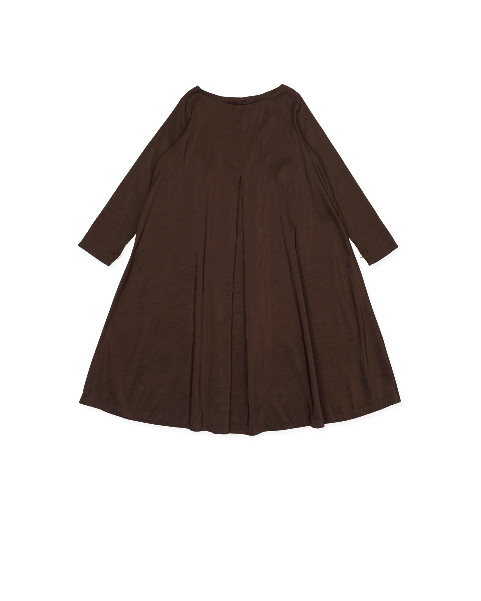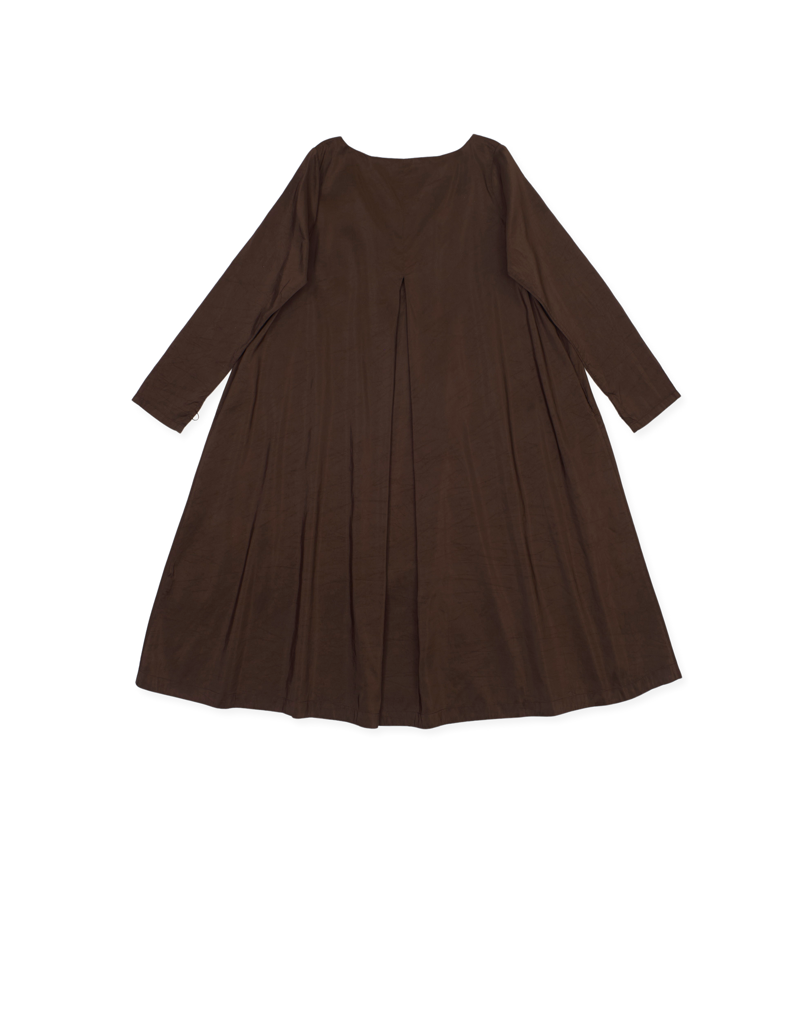 hazelnut a-line dress, long sleeves, rounded collar, front and back pleat