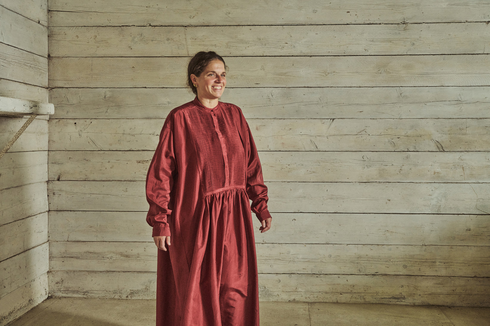 long sleeved dress, pin tuck bib front, buttoned cuffs, side seam pockets