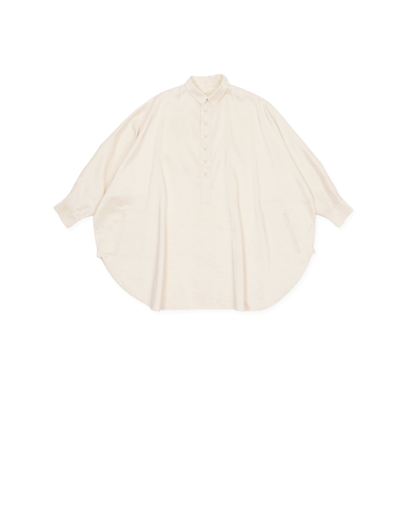 cream oversized shirt, wide cut, tapered sides, slant front pockets