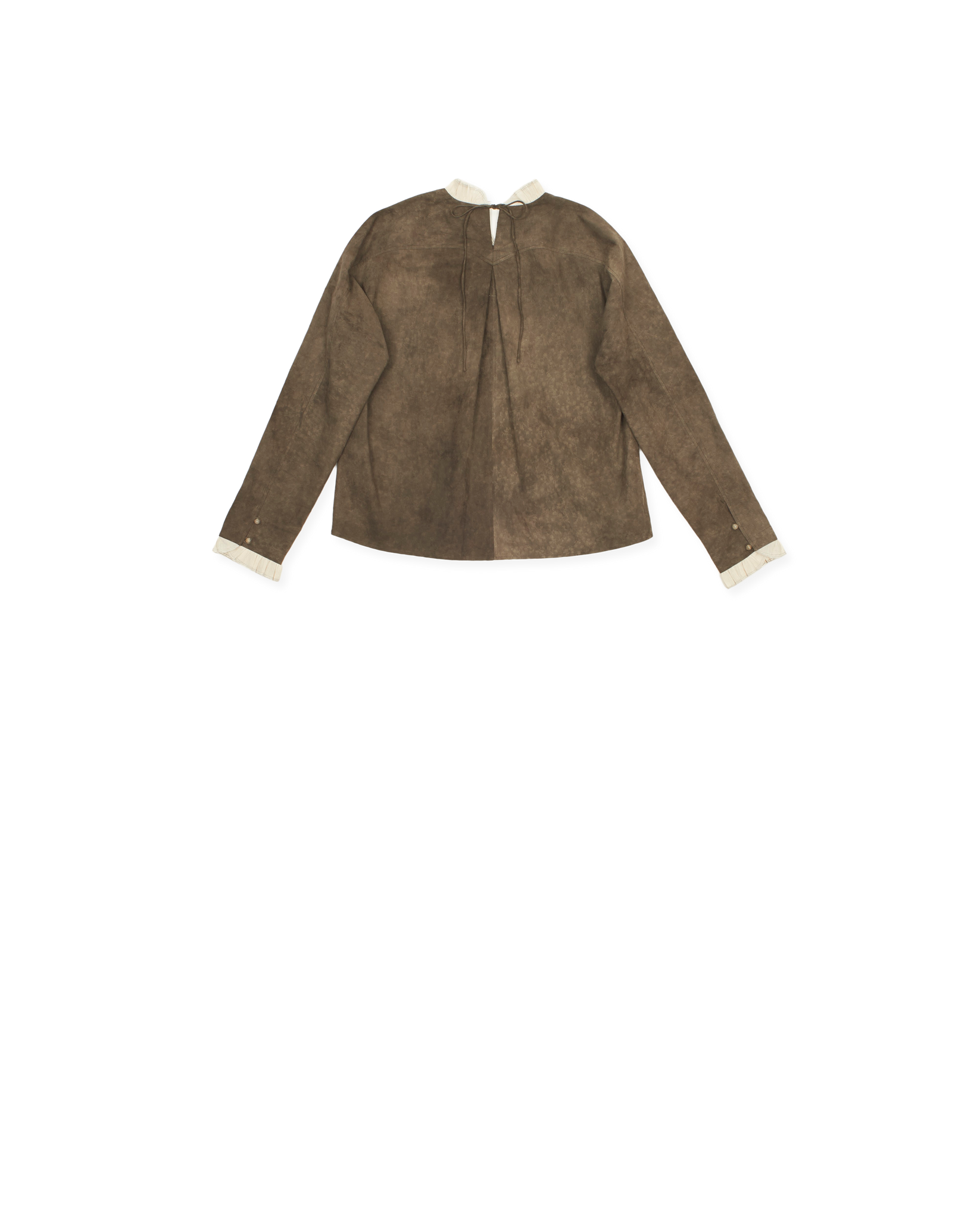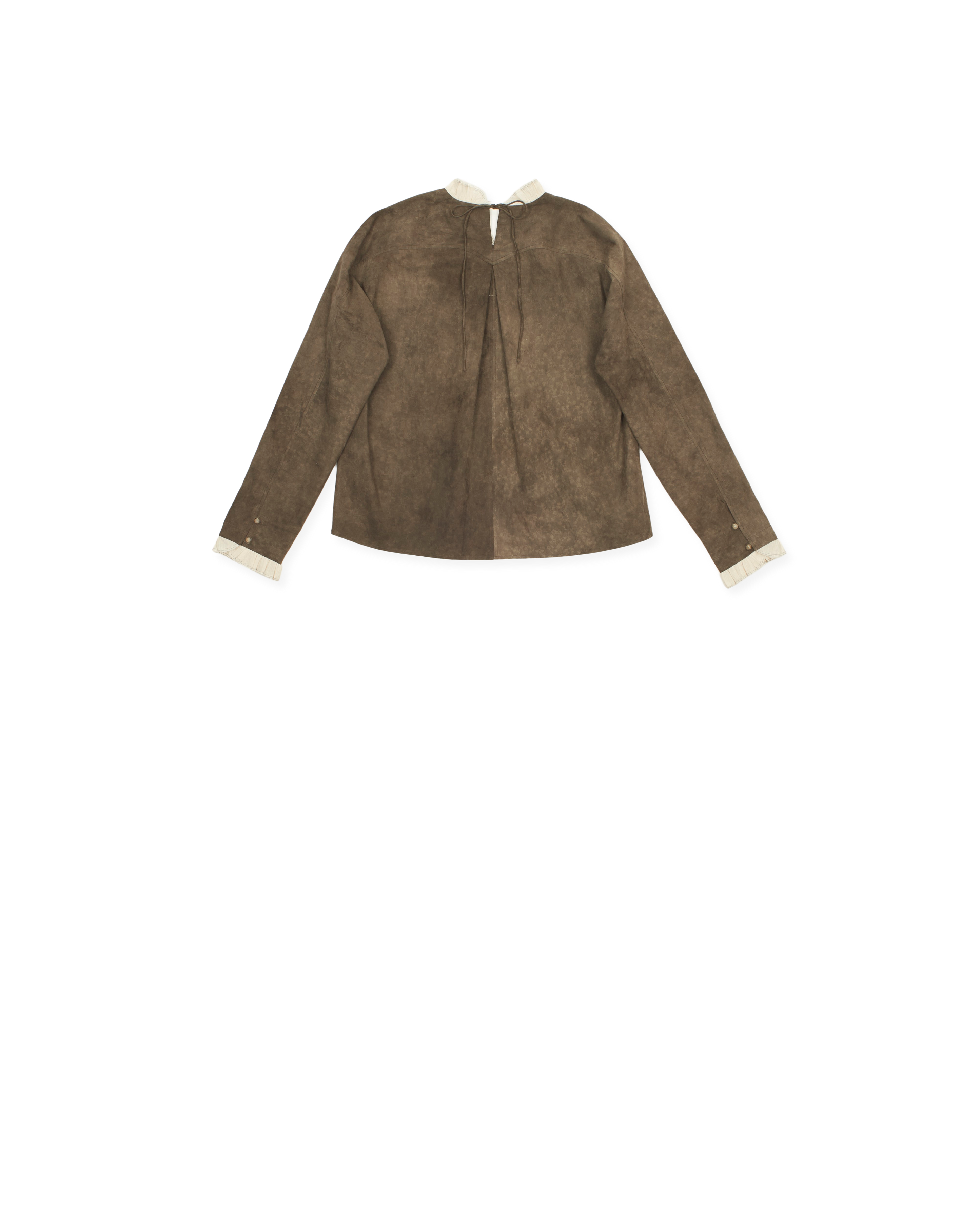 fitted back pleat shirt, ribbon neck fastening, jade bead cuffs backed with shell buttons, stitched neck and cuffs